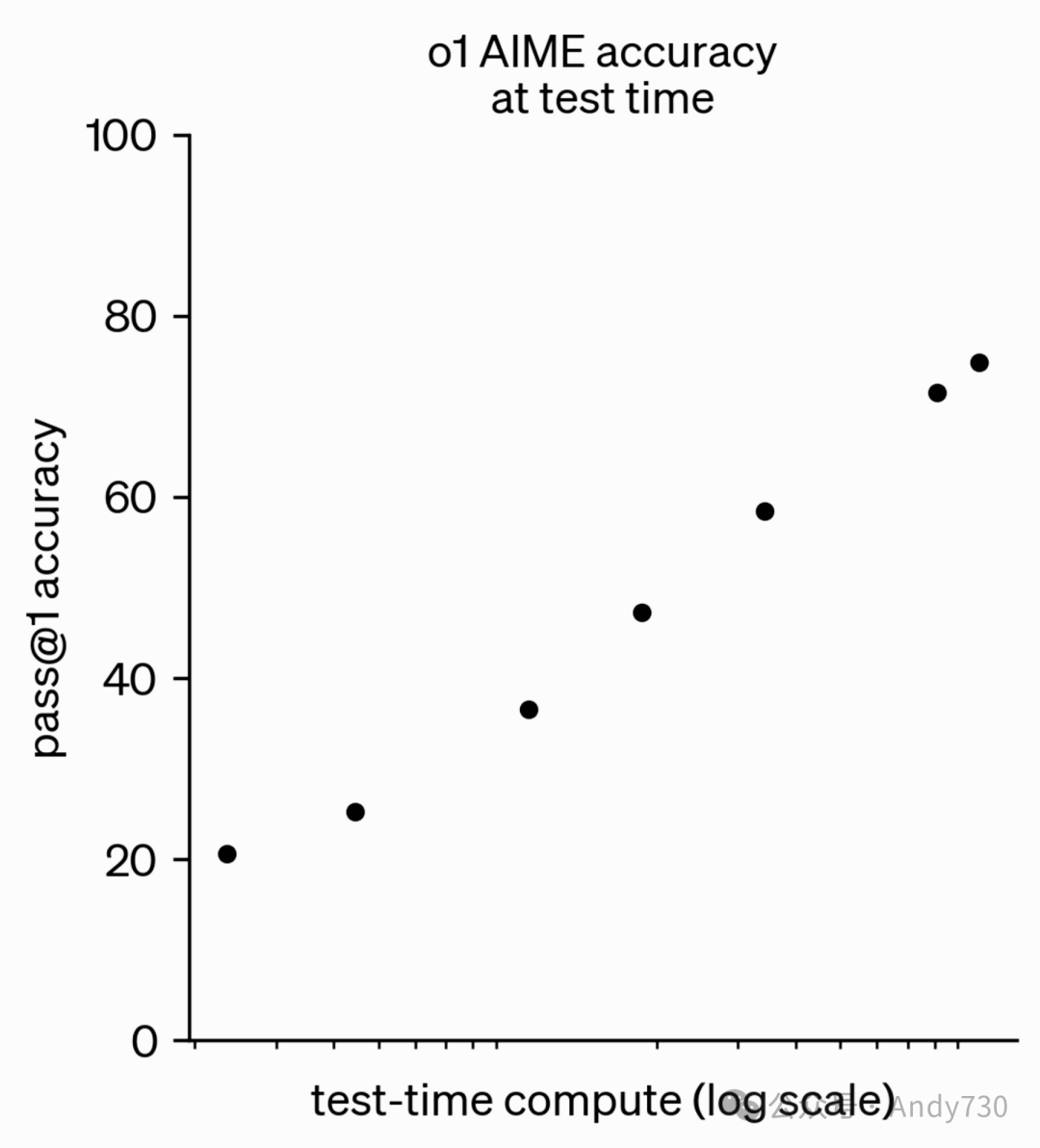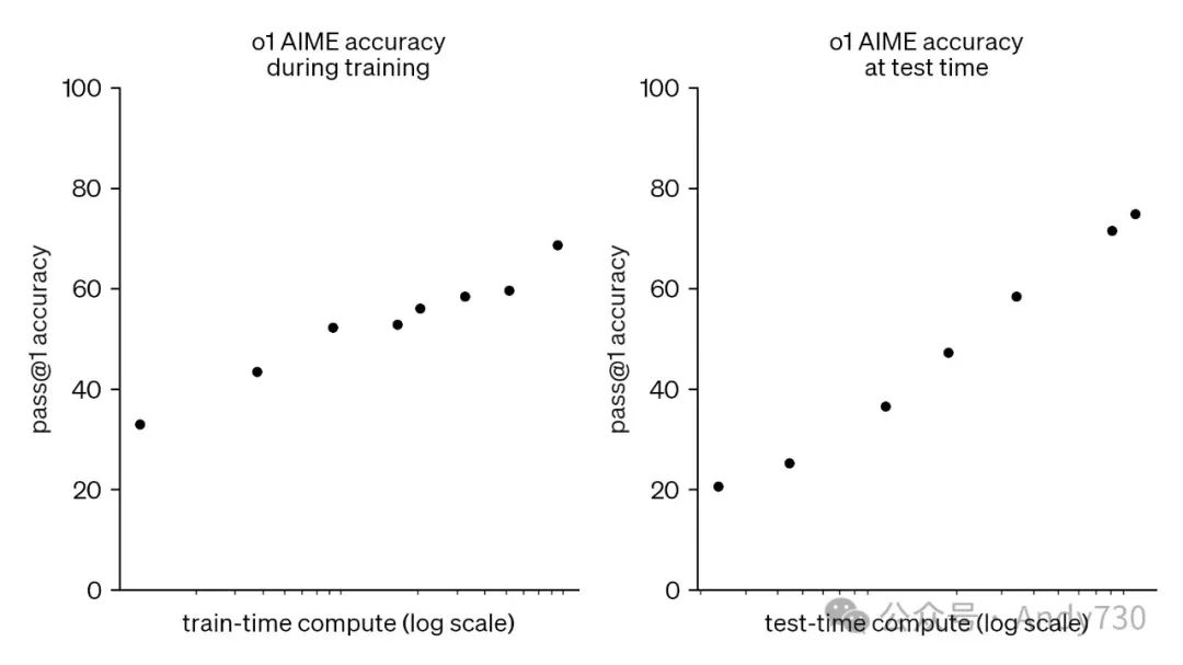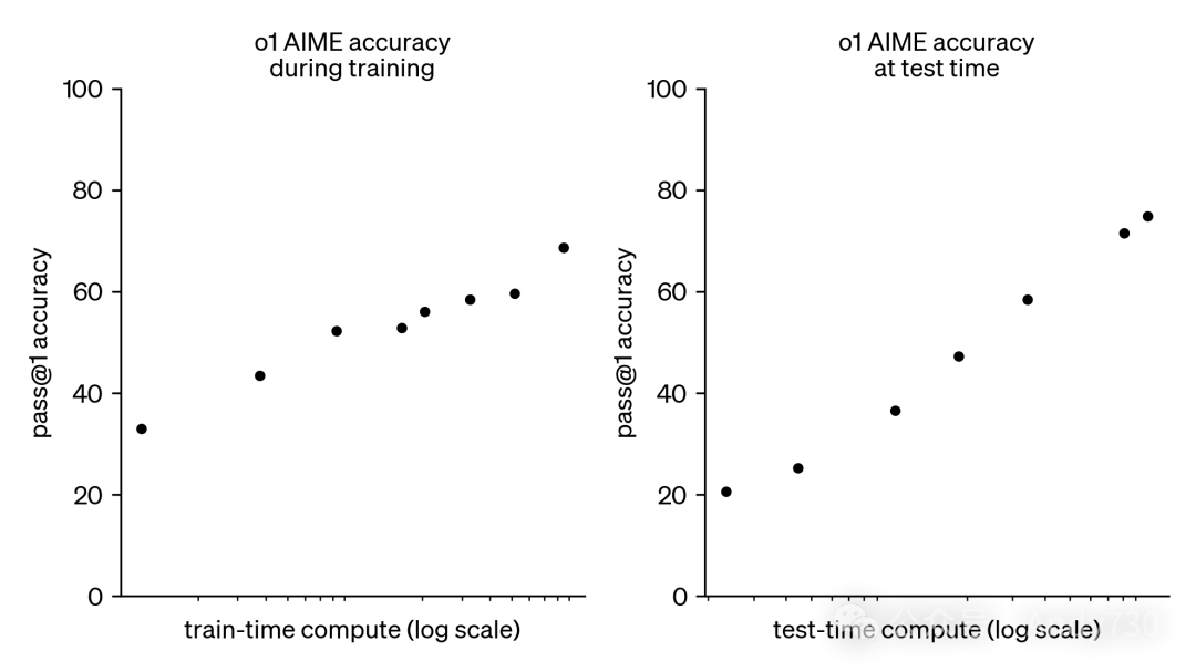 o1的性能在训练时和推理时计算量的增加下平滑提升