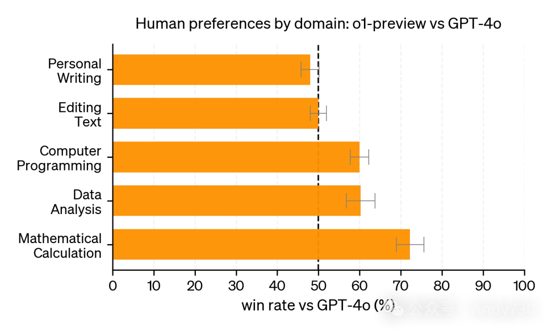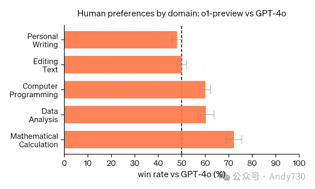 人们在那些需要更好推理能力的领域更偏好o1-preview。