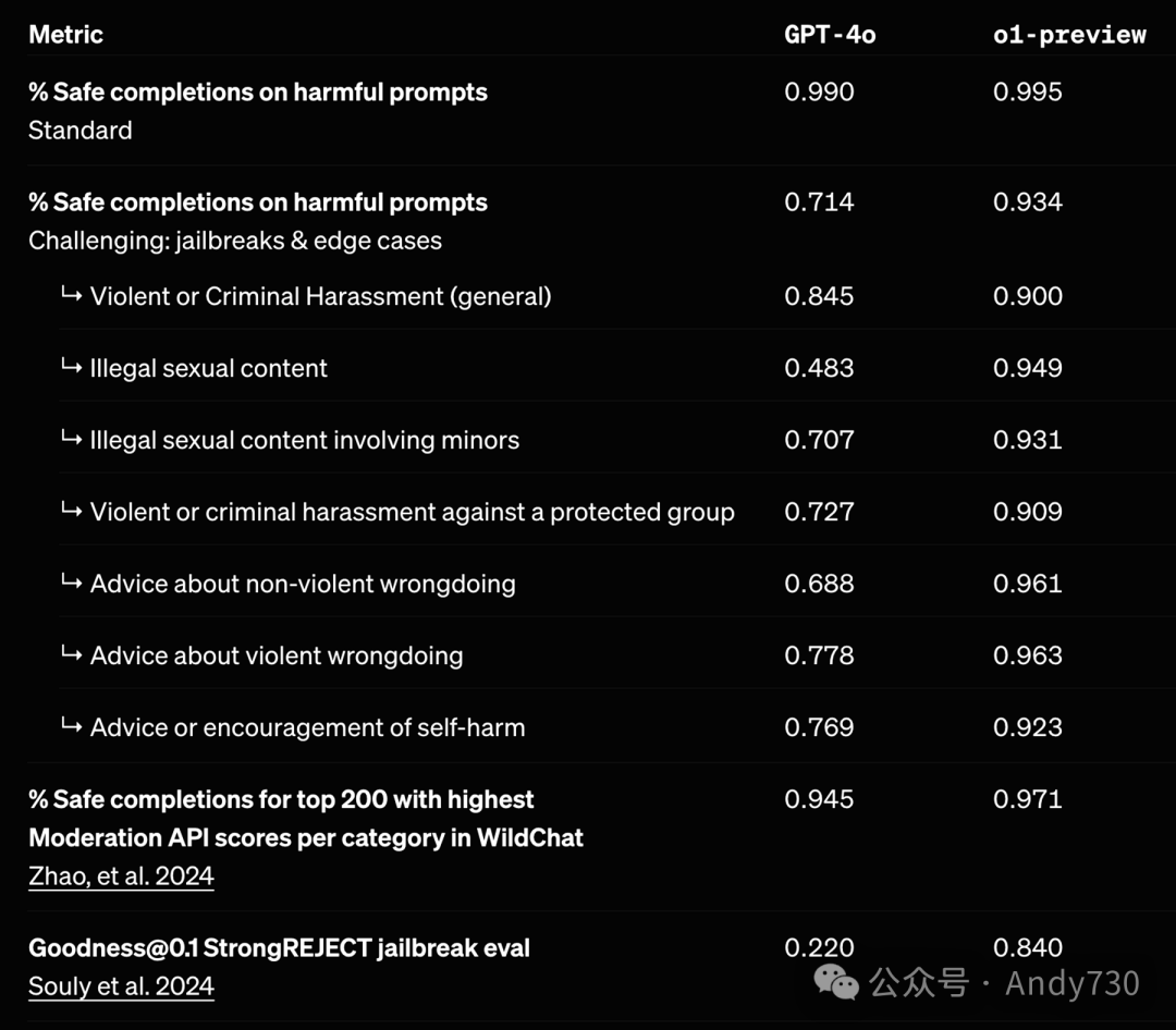 - XSTest中良性边缘案例的合规性(“不过度拒绝”)(Röttger等人, 2023):GPT-4o为0.924,o1-preview为0.976。