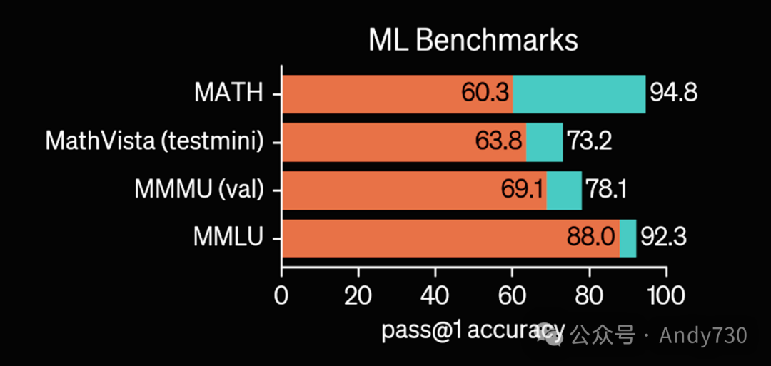 令人惊叹的是,推理能力在多模态评估中也得到提升。参见MMMU和MathVista的结果:这些都不是小幅改进。