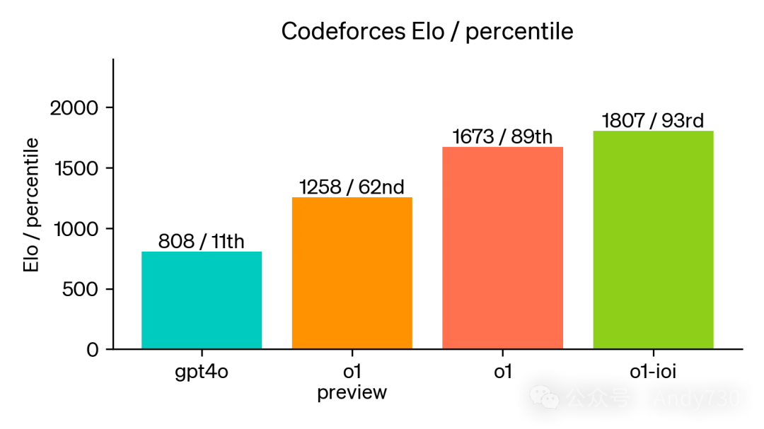 我们还模拟了Codeforces主办的编程竞赛,严格遵循竞赛规则,允许10次提交。GPT-4o的Elo评分为808,位于人类参赛者第11百分位。该模型远超GPT-4o和o1,获得1807的Elo评分,超过93%参赛者。