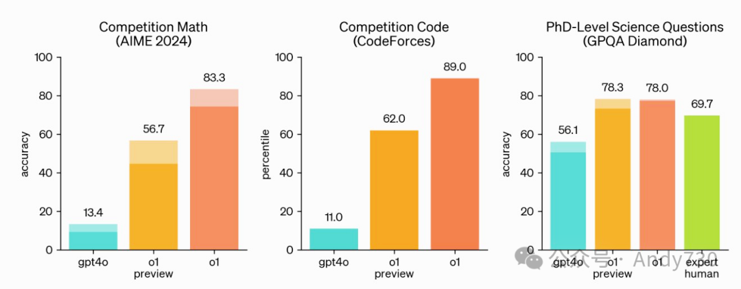 在许多推理密集型基准测试中,o1表现可媲美人类专家。近期前沿模型在MATH和GSM8K等基准测试中表现出色,以至于这些基准不再能有效区分模型。我们在AIME考试上评估数学表现,AIME专为挑战美国最优秀高中生设计。2024年AIME考试中,GPT-4o平均仅解决12%(1.8/15)题目,而o1单样本下平均解决74%(11.1/15),64样本共识达83%(12.5/15),使用学习得分函数对1000样本重排序后达93%(13.9/15)。13.9分已列入全国前500名,超过美国数学奥林匹克入围门槛。