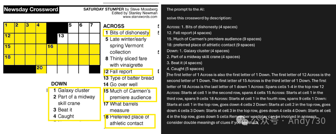 大型语言模型(LLM)反复迭代,创造并淘汰各种想法。结果相当令人印象深刻,它的表现也很出色……但o1-preview似乎仍然基于GPT-4o,它在解决这个有些不公平的谜题时显得过于字面化。1横“Galaxy cluster”并不是指真实的银河系,而是指三星Galaxy手机(这也让我困惑)——答案是“APPS”。卡在真实银河上,人工智能不断尝试实际的银河团名称,最终决定1横是COMA(这是一个真实的银河团——我之前不知道)。因此,其他结果并不完全正确,也没有完全符合规则,但相当有创意:1纵是CONS,12纵是OUCH,15纵是MUSICIANS,等等。