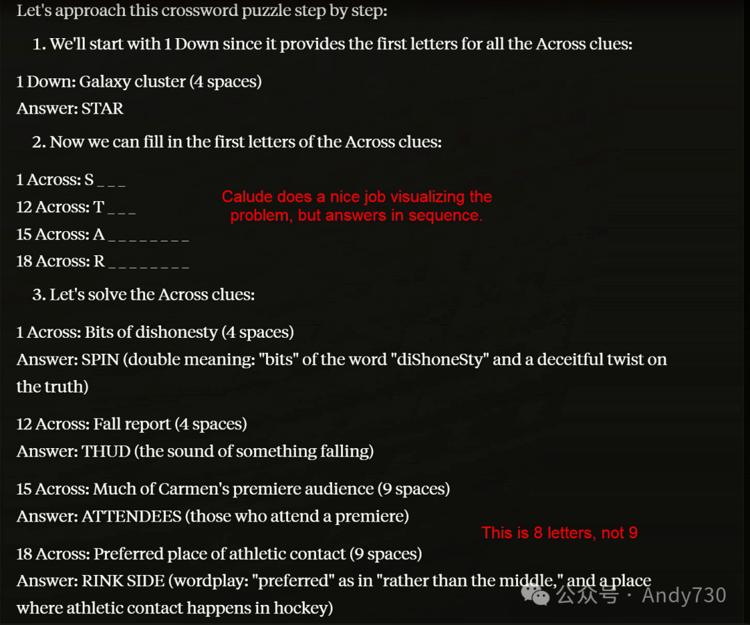 填字游戏对大型语言模型特别困难,因需要迭代解决:反复尝试和排除多个互相影响的答案。这超出了传统大型语言模型的能力,它们只能逐步添加词或符号。例如,Claude首先猜1-下为"STAR",错误后陷入困境,无法继续解题也未接近正确答案。缺乏规划过程,Claude只能直线思考。