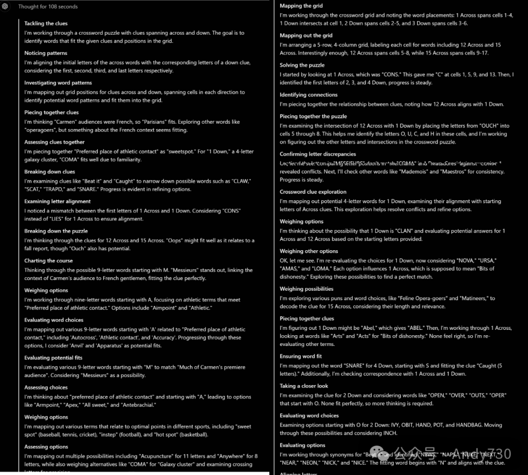 为进一步探索,我提示:"1下的答案是APPS。"AI再次思考一分钟,不断迭代想法。最终答案完全正确,解决所有困难引用,尽管幻想出了不存在的23横提示。