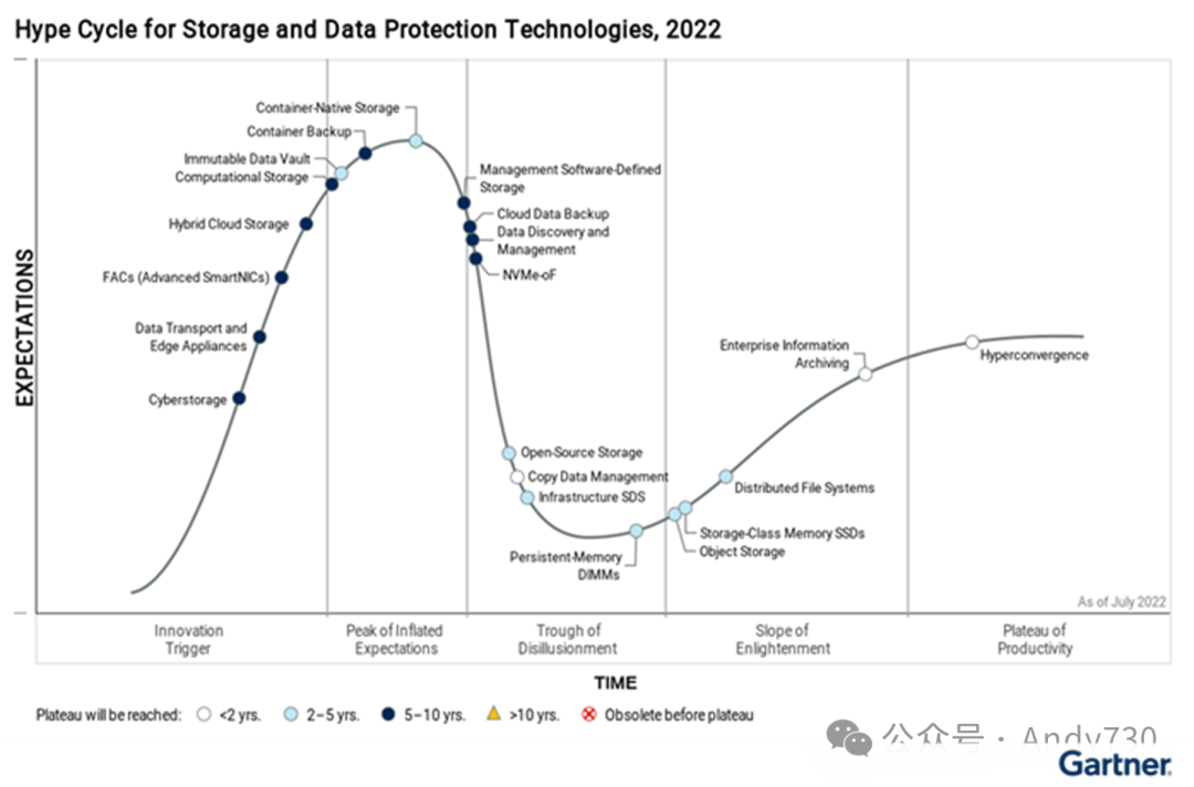 技术萌芽期(Innovation Trigger) | l Cold Storage l DNA Storage l Edge Storage l Cyberstorage l Enterprise Storage Platform | l DNA Storage l Cloud Infrastructure Recovery Assurance Software l Isolated Recovery Environment l Cyberstorage l Edge Storage | l Cyberstorage l Data Transport and Edge Appliances l FACs (Advanced SmartNICs) l Hybrid Cloud Storage |