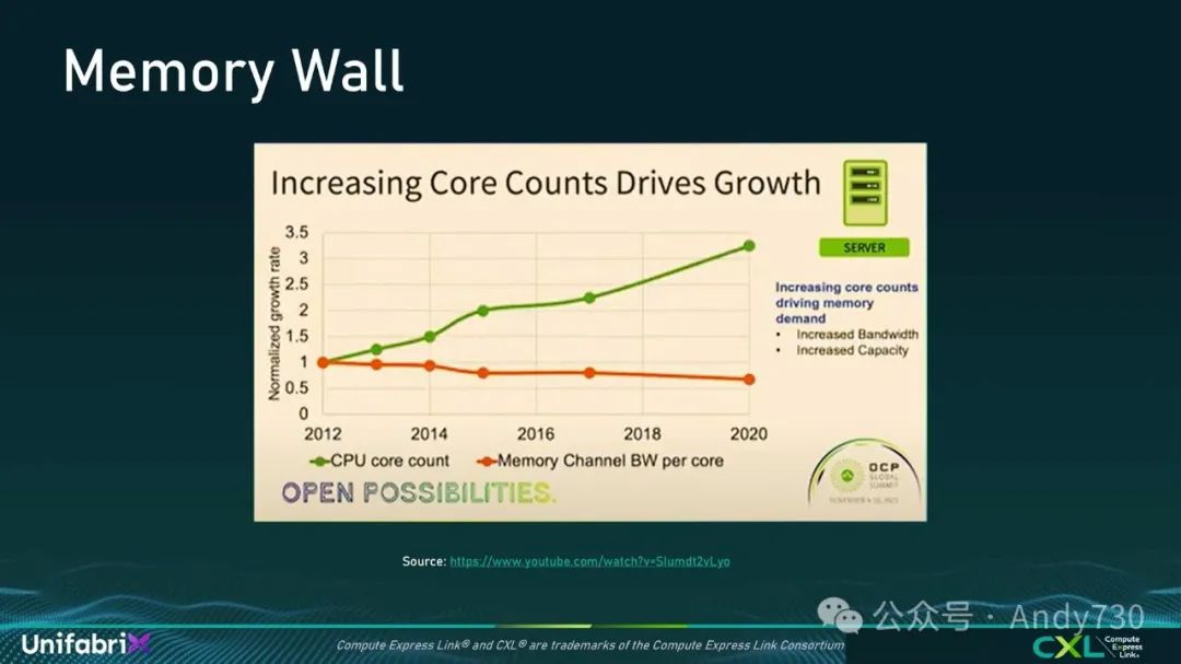 什么是内存墙?让我们回顾一下几年前(约2021年)IBM在OCP峰会上的演示。幻灯片中,橙色条形图展示了内存通道带宽,尤其是每个核心的内存通道带宽。绿色条形图则显示了核心数量的增长趋势。这一趋势从2012年的大约两个核心开始,逐步增加到四个核心,而现在正朝着64到128核心的方向发展。