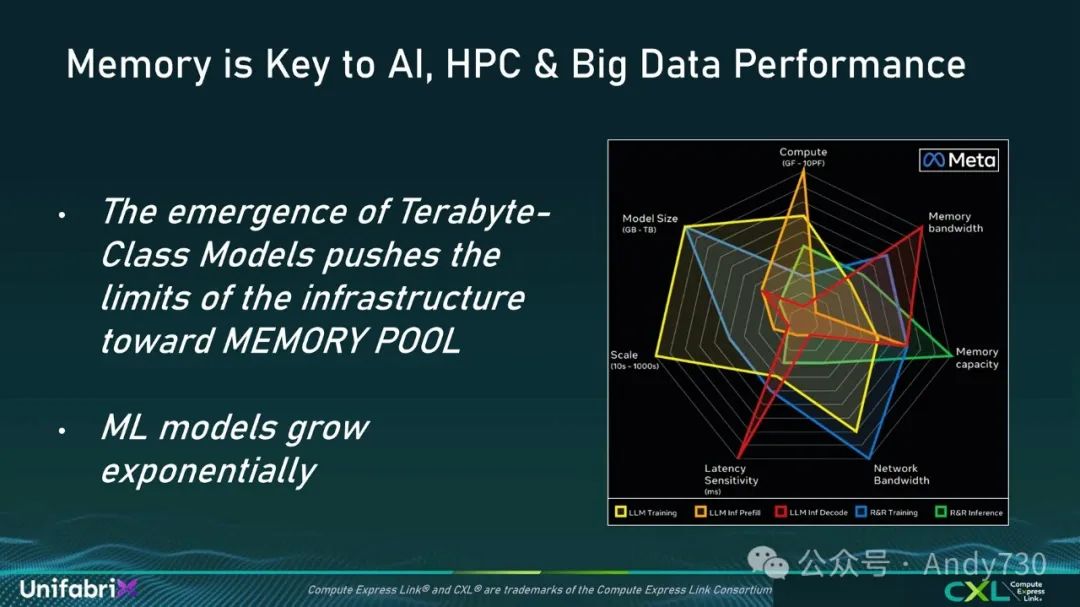 去年Meta在MeCon上展示了AI实施面临的挑战。右上角的红色区域突出显示了内存带宽对大型语言模型推断的限制。绿色条形图则展示了内存容量对推荐引擎推断的限制。整体来看,左侧显示模型大小从几GB增长到TB级别。这些挑战都可以通过内存池来解决。