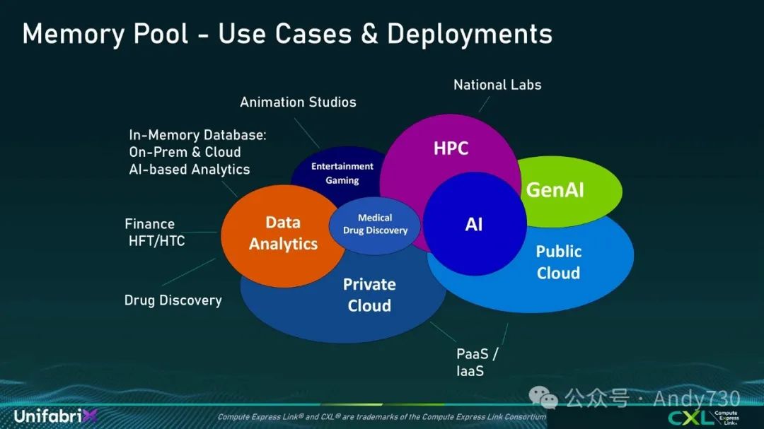 云计算:目前,私有云和公有云都提供了将特定内存附加到每个核心的实例。未来,有了内存池,我们将能够提供"内存即服务"。这意味着随着核心数量的增加,我们也可以灵活地增加每个核心的内存量。这将是一种全新的内存使用模式。 生成式AI(GenAI):大型语言模型通常需要TB级的内存。内存池可以满足这一需求,使单个实例能够支持大型语言模型,并为每个用例提供定制化实现。 高性能计算(HPC):例如数值计算,这类应用需要每个计算节点拥有大量内存。 视频处理:如动画工作室需要渲染8K等高分辨率视频,这需要将大量数据存储在内存中以进行完整渲染。 医疗药物发现:也是内存池的重要应用场景。以DNA测序为例,一份DNA数据通常约为1TB。要比对这些序列并建立匹配不同个体DNA的完整能力,需要大量内存。DNA测序本质上是一种内存密集型应用。 高频交易:高频交易中的数据分析也面临类似挑战,需要比对来自不同数据库的海量数据,这往往导致CPU出现内存瓶颈。