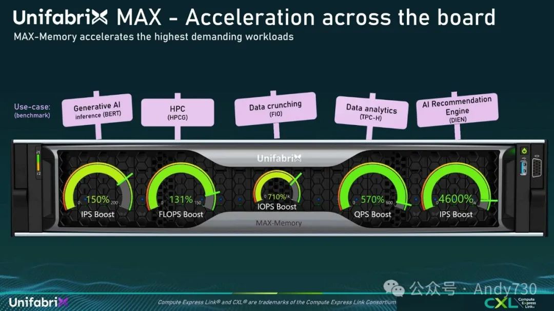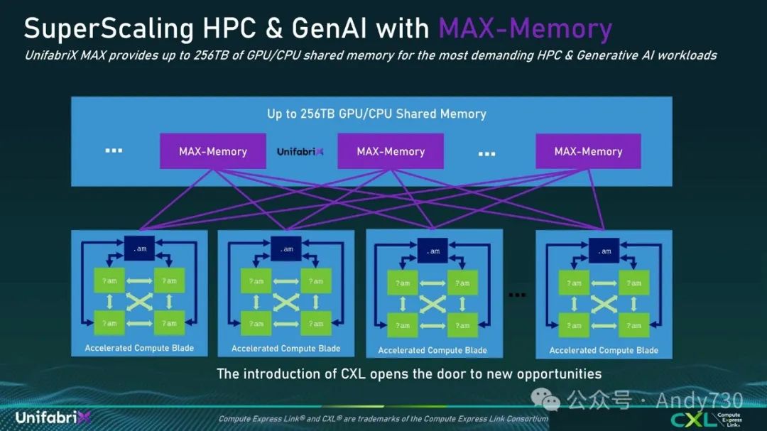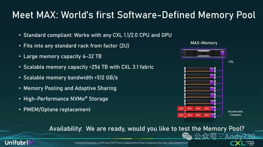 展望未来,正如我们所说,Max Memory是一个单一的箱体连接到不同的主机。在多机架环境中,我们将能够连接多个Max系统到数百个节点,将CPU连接到GPU,并从Max Memory向多个主机提供内存。这种架构对于生成式AI和HPC特别具有吸引力,因为它允许数百个节点连接到多个Max Memory系统,在它们之间共享内存。这将由一个交换网络管理,该网络可以监控所有主机和所有Max Memory系统,实现所有节点间的内存共享。