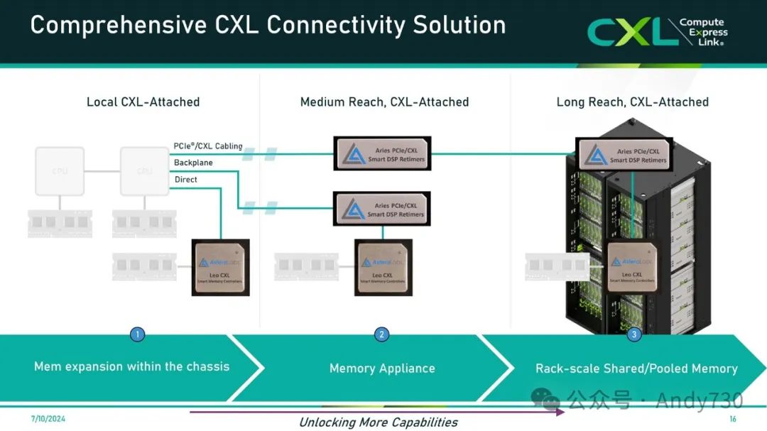 CPU直接附加的CXL内存扩展,通常通过CAM或EDSFF使用。 短距离CXL附加内存解决方案,通常与MX等线缆解决方案一起使用,适用于扩展模块相对于主板的不同位置。 新推出的Leo智能线缆模块,支持高达7米的主动铜PCIe和CXL连接,以及高达50米的光模块。