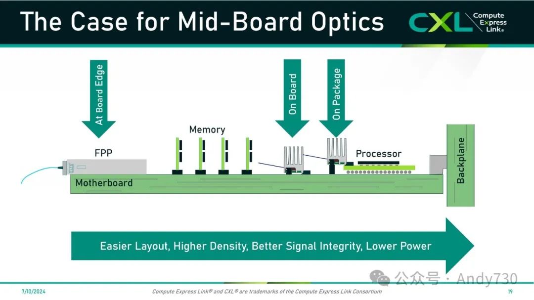 光学收发器MSA标准解决方案是数据中心前面板连接的基础。它们具有成本效益、已知的规格尺寸、稳定的供应链,并在行业中得到广泛采用。然而,AI/ML和分布式计算的突破要求在机架内部、机架间以及GPU集群中采用新的拓扑结构。中板光学提供了改进的信号完整性(SI)、更高的密度以及对系统架构师在支持CXL的创新拓扑中更多的灵活性。
