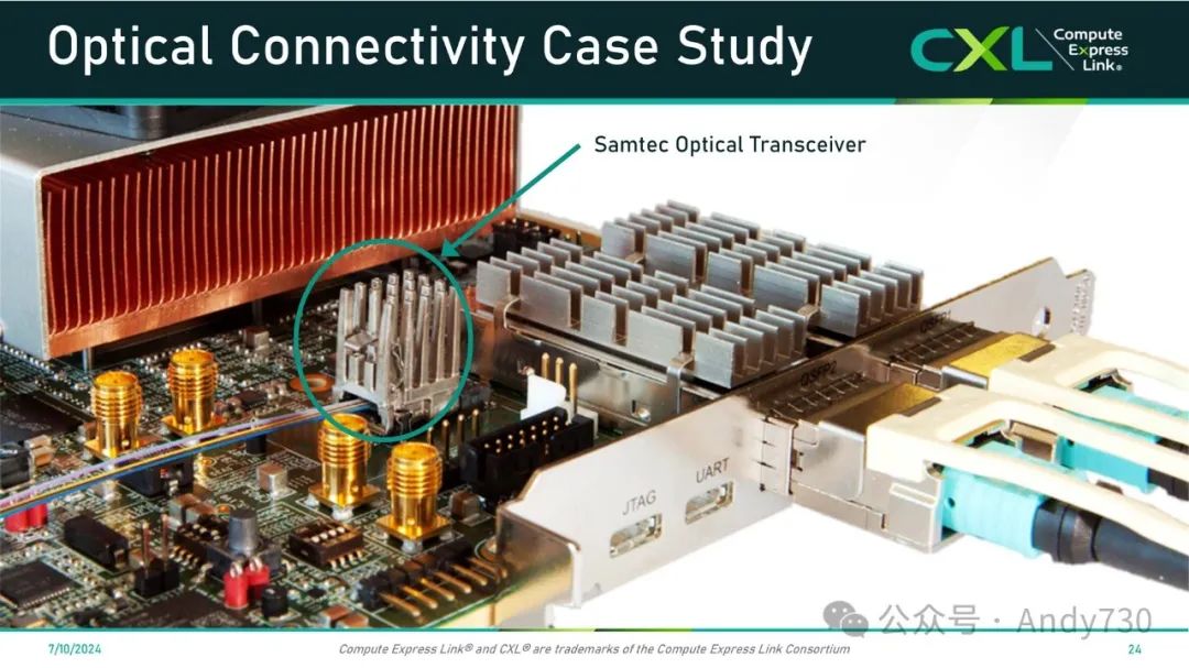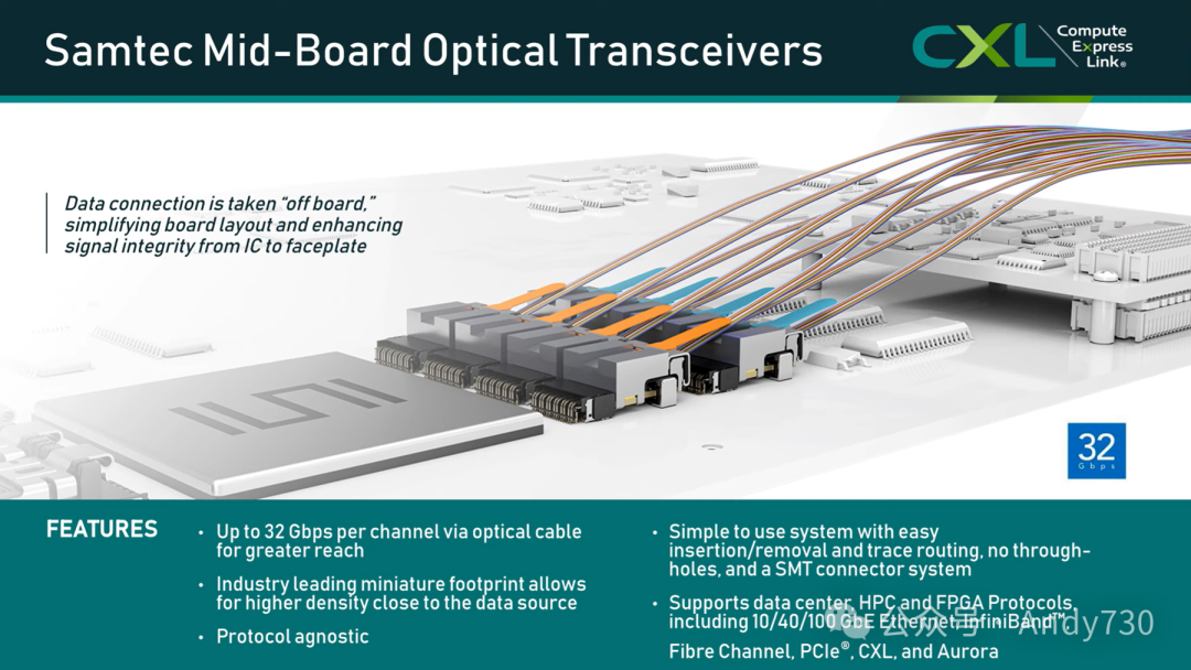 我们的中板光学收发器还有一个显著优势:它们在系统中非常容易安装和拆卸。它们是表面贴装的,无需过孔,因此可以利用标准制造工艺。从协议角度来看,我们与客户合作,不仅支持以太网光学、InfiniBand光学、光纤通道光学,还特别支持本次网络研讨会的主题——PCIe和CXL光学。