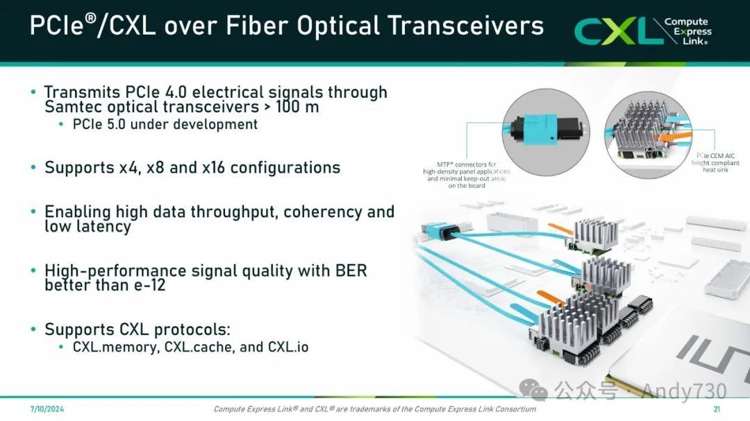 关于PCIe/CXL通过物理层光学接口的问题,我们有一个专门针对PCIe基础设施的光学收发器系列,CXL正是建立在这一基础设施之上。这些光学收发器符合PCI-SIG定义的物理层和电气信号标准,支持在100米范围内的电光转换。我们目前正在开发PCIe 5,预计到2024年底会有中板可用的PCIe 5光学收发器。
