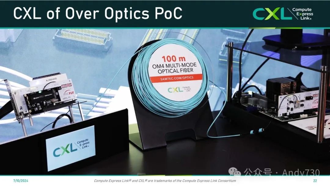 我们首次展示CXL over optics的概念验证是在2023年秋季的超级计算大会上。我们展示了一个具有本地CXL支持的AMD Genoa平台。Samtec设计了一款PCI Express规格尺寸的扩展卡,配备了我们的PCI Express和CXL光学收发器。我们使用了x8配置(实际上是两个x4模块)。通过这个设置,我们能够通过一个端点访问CXL设备,并在100米的光纤上访问内存。