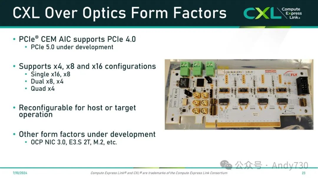 这是一个有意思但复杂的问题。CXL协议利用了各种PCIe规格所定义的物理和电气接口,例如CXL 1.1/2.0和PCIe 5.0以及CXL 3.1和PCIe 6.0等。主机和内存池之间的硬件接口可以利用由PCI-SIG、SNIA、OCP等标准组织定义的任何拓扑。目前市场上已经可以看到利用PCIe 5.0接口的E3.S 2T规格尺寸的CXL内存模块。PCI-SIG CEM AIC规格尺寸也非常流行。新的PCI-SIG CopprLink线缆规范还引入了内部和外部线缆方案。光学CXL互连也是可选的。最终,主机和内存池之间的硬件接口将取决于具体的使用场景和拓扑需求。