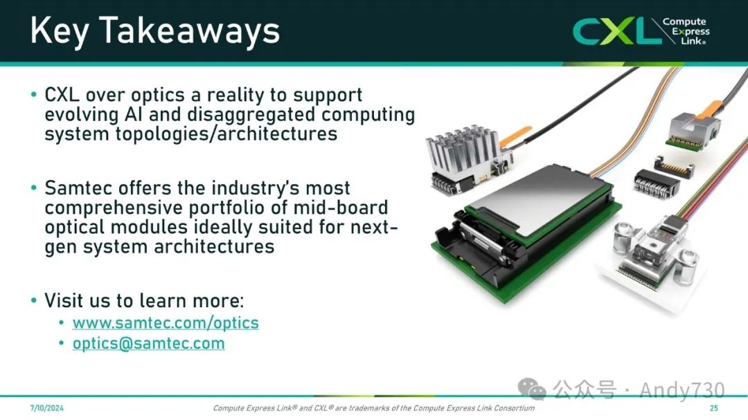 总结起来,由于AI和数据中心内分离计算的发展,CXL over optics已经成为现实。Samtec拥有业内最全面的中板光学模块和中板光学收发器产品系列,能够支持下一代系统架构。我们期待着这项技术在未来的广泛应用和进一步发展。