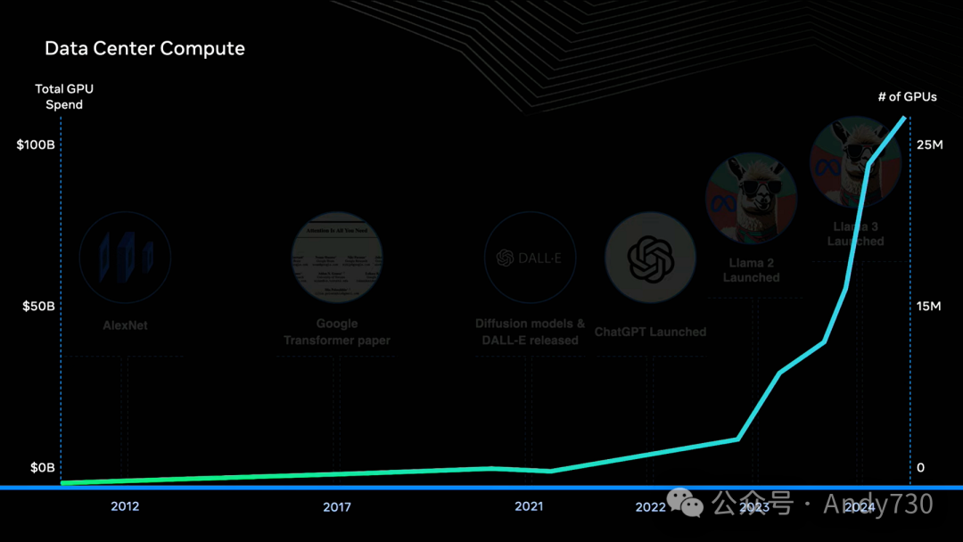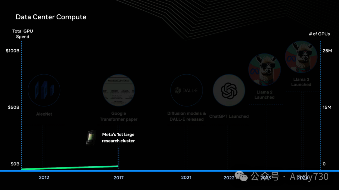 简述数据中心计算历史:几十年来,数据中心一直由x86架构CPU主导。然而,GPU在浮点运算方面优势明显,而这正是模型学习的核心。2012年前,数据中心GPU数量几乎可忽略。2017年开始出现大型研究集群。Meta也建立了首个研究级超级计算机,数据中心GPU数量随之增长。