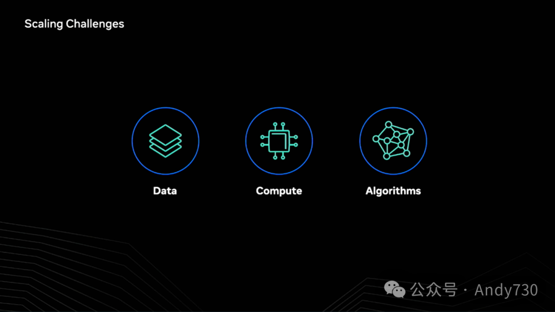让我们讨论扩展这些模型以实现宏伟目标时面临的挑战。当前模型基于三个输入在可预测地改进:数据、计算和算法。