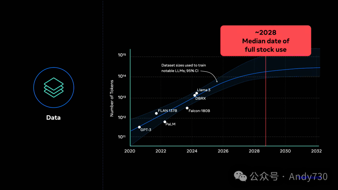 首先是数据。训练这些模型所需的数据量巨大。每一代模型训练都会添加更多数据,达到数万亿token。例如,LLaMA 3.1的训练使用了超过15万亿个token。