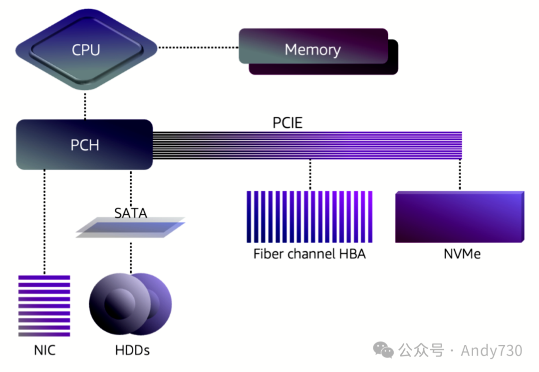 在深入讨论之前,我们先回顾一下计算机系统与存储的交互方式。多年来,高层次的基本原理始终没有改变。存储设备通过总线连接到CPU。CPU将请求依次排列,并通过总线传递给设备。存储设备要么从CPU内存中读取数据,然后将其存储到持久化介质上,要么从持久化介质中读取数据,再将其传输到CPU的内存中。