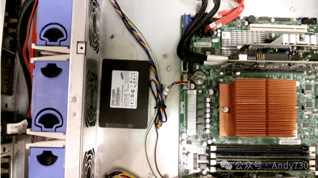 机箱中有空闲空间,但唯一不干扰冷却气流的地方是在主板和风扇之间。SSD的优点是通常体积小且重量轻,但我们不能让它们在机箱内松散摆放。经过一些试验和材料科学家的帮助,我们找到了一种耐热的工业强度魔术贴,这也让我们可以在服务器的剩余使用寿命内对这些SSD进行维护。