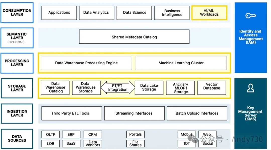 本文探讨如何利用现代数据湖参考架构来满足AI/ML需求。下图展示了现代数据湖参考架构,并重点标出了支持生成式AI所需的能力。