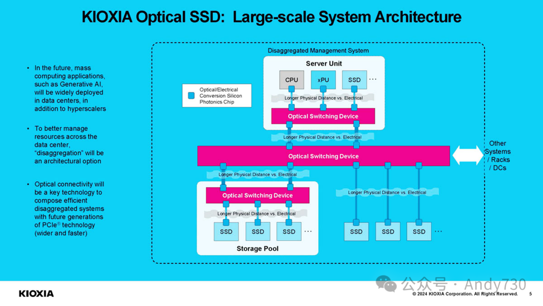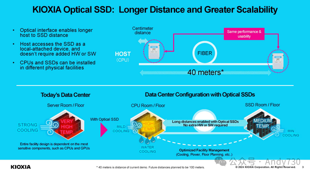 另一大优势在于可通过光学方式进行切换。这是一个重要亮点,但也存在一些限制。理论上,即使使用100米的短距离光连接,仍可通过交换机聚合带宽、共享设备,并扩展SSD与主机服务器之间的距离。