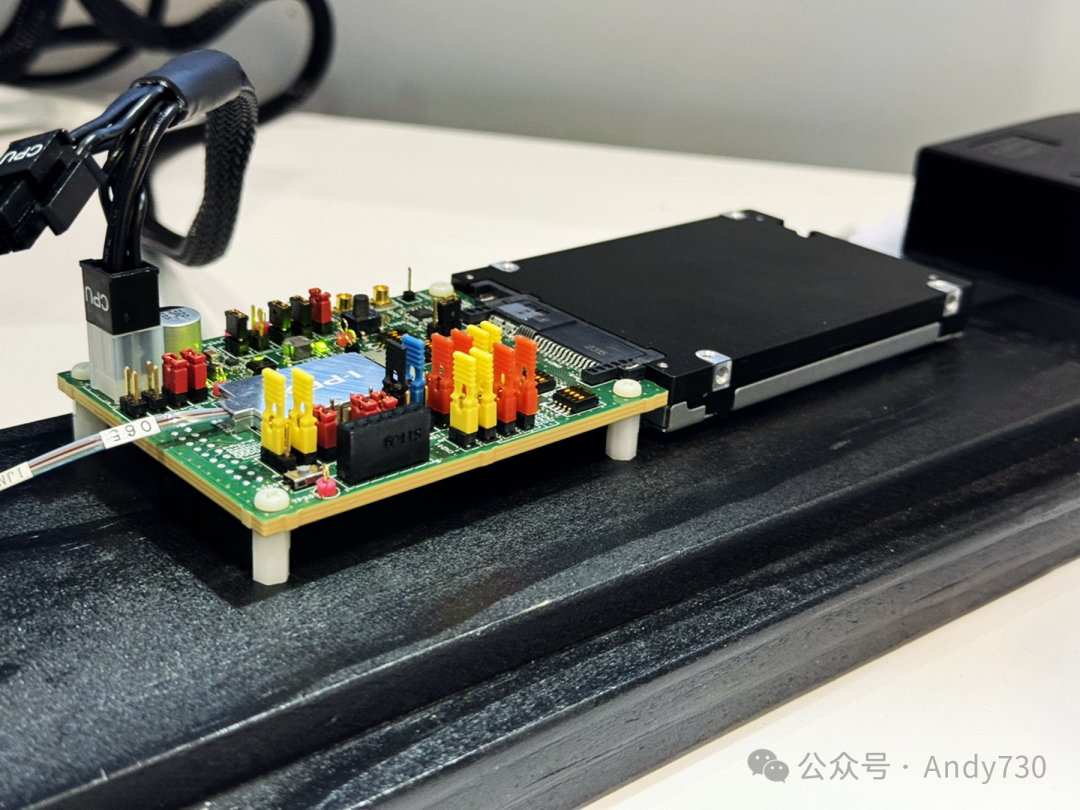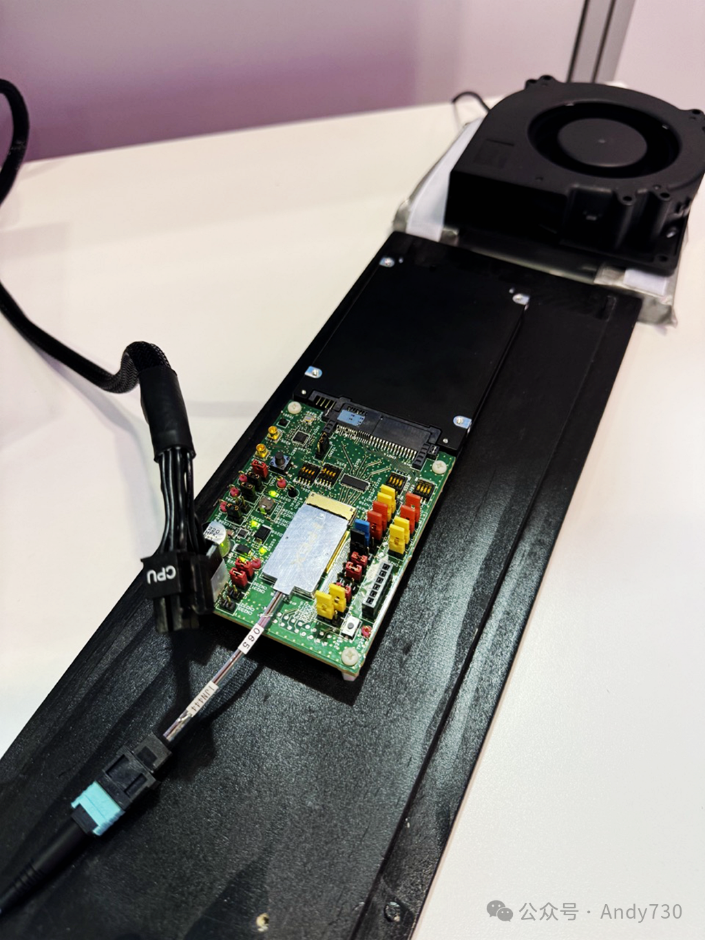 该SSD连接到一个将PCIe信号转换为光信号的板卡上。理论上,这种技术也可应用于GPU等设备。本次演示更像是光传输的PCIe(不含电气部分),而非将其转换为以太网等其他协议。