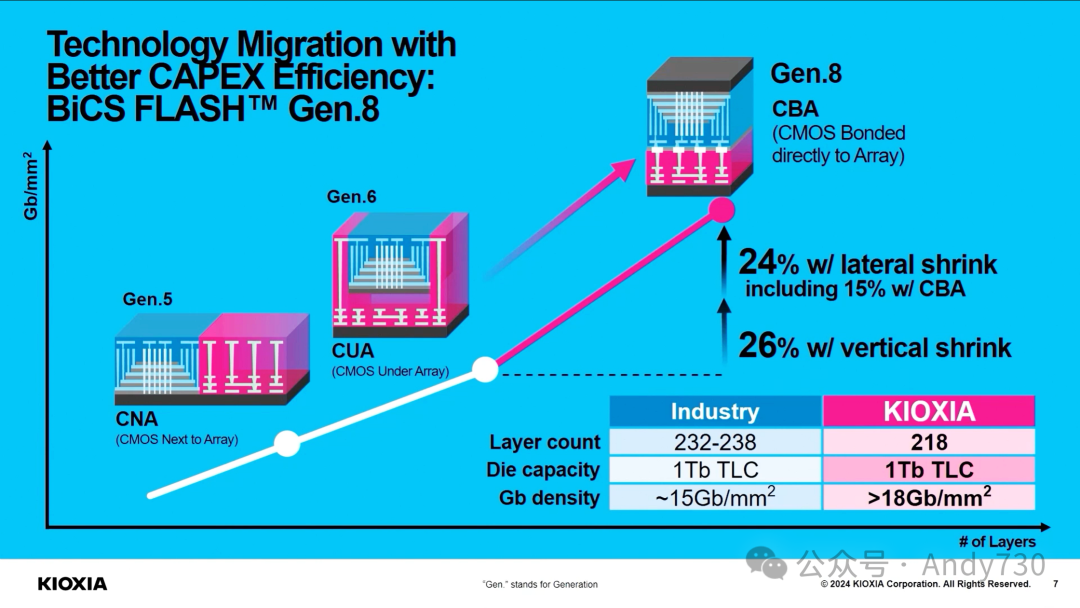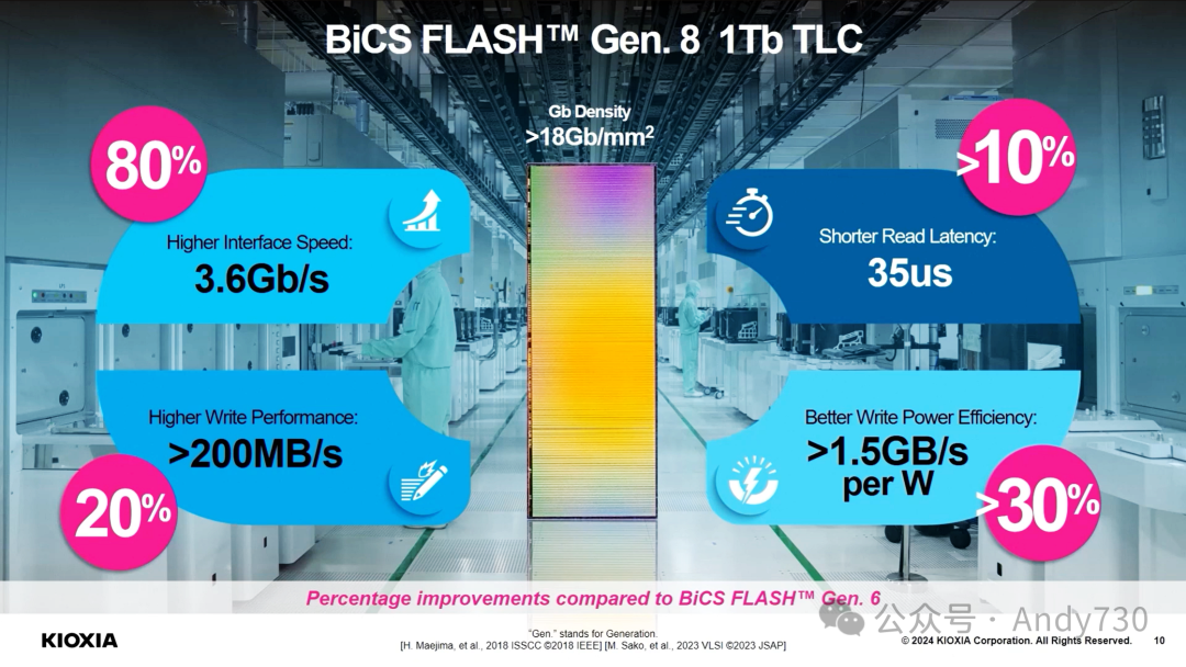 集成218层结构,相比BiCS 5的112层和BiCS 6的162层有显著提升。 跳过了BiCS 7(可能仅作内部测试用),保留了BiCS 6的四平面电荷陷阱结构。 TLC模式下为1 Tbit容量,QLC版本提供1 Tbit和2 Tbit两种选择。
