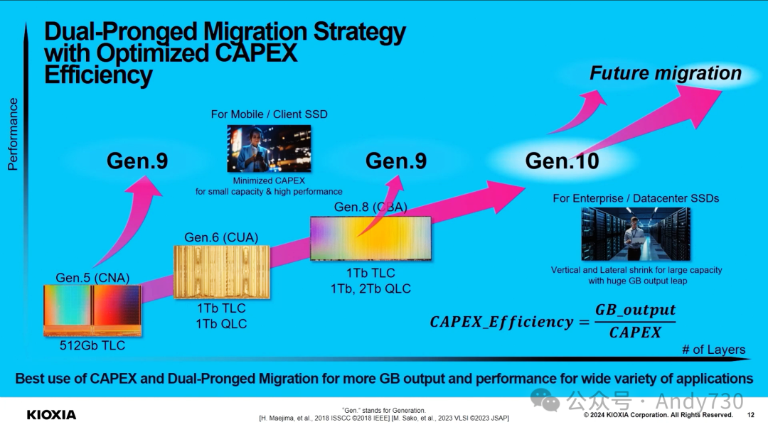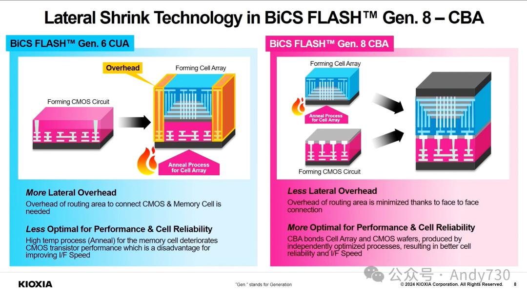 CBA混合键合工艺优势:相较于其他供应商目前使用的工艺,如Micron的"阵列下CMOS"(CuA)和SK hynix的"4D PUC"(芯片下周边电路)工艺,CBA混合键合工艺展现出明显优势。预计其他NAND供应商最终也会采用类似Kioxia的混合键合方案。