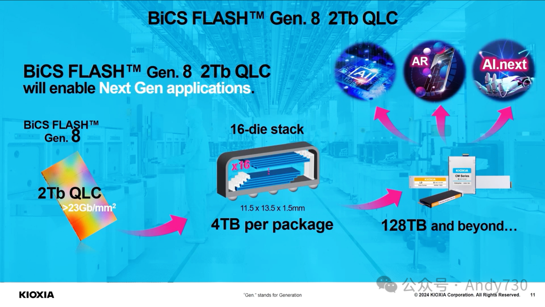 进行了BiCS8 128TB高容量QLC eSSD技术演示,该技术专为快速AI数据湖及容量密集型性能应用而设计。