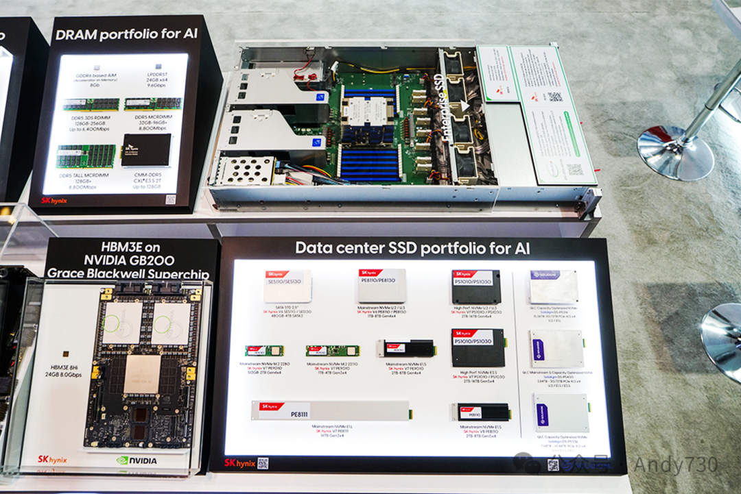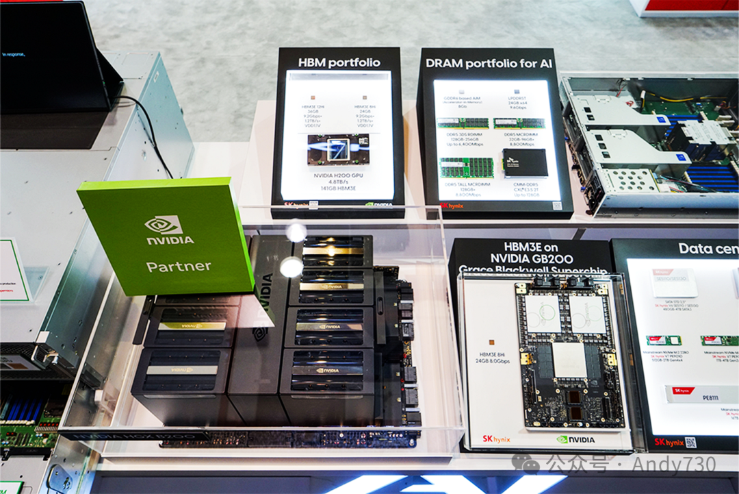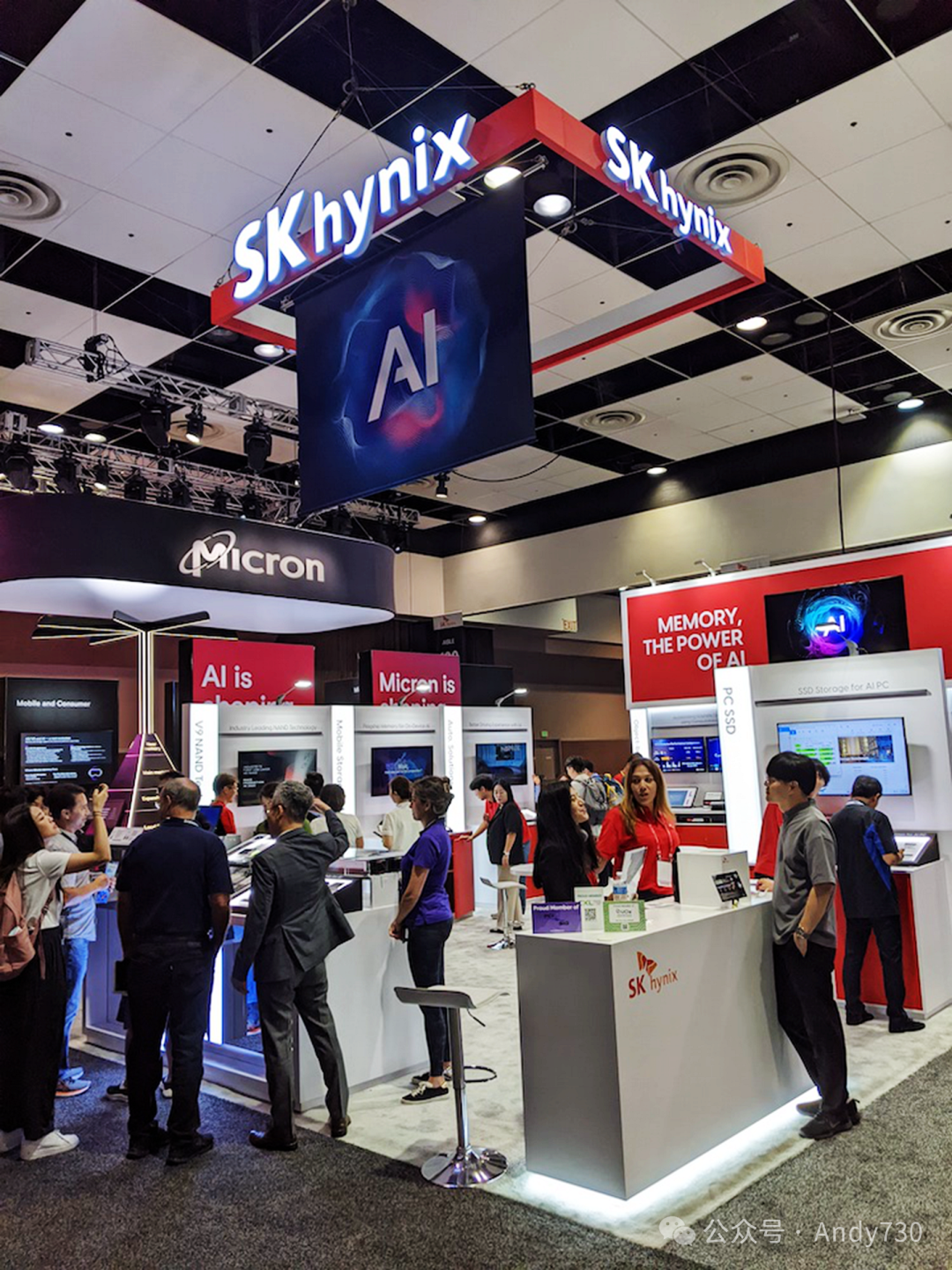 SK hynix的展位分为四个部分,展示了多款在主题演讲和技术会议中提到的产品。展位亮点之一是12层HBM3E样品,这是一种下一代AI存储解决方案,预计2024年第三季度开始量产。