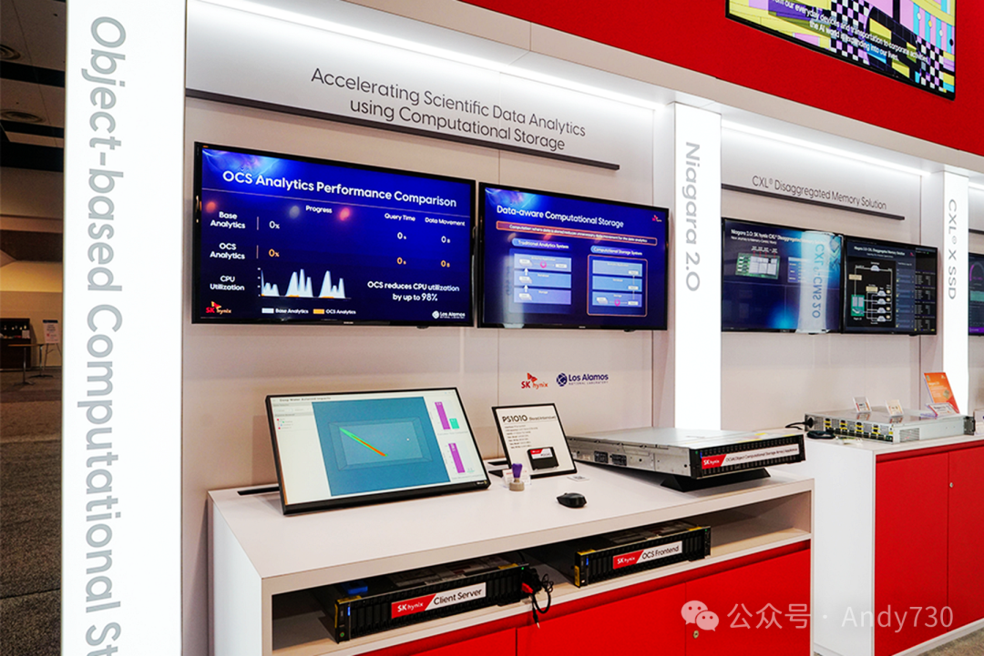 这一技术旨在缩短物理模拟数据的分析时间。SK hynix在2023年丹佛举行的超级计算大会(Supercomputing 2023)上展示了其OCS原型系统与LANL合作的成果,显示出超过6.5倍的速度提升。OCS“可以独立完成数据分析,而无需计算节点的帮助”,并强调了其作为HPC中计算型存储未来潜力的技术。