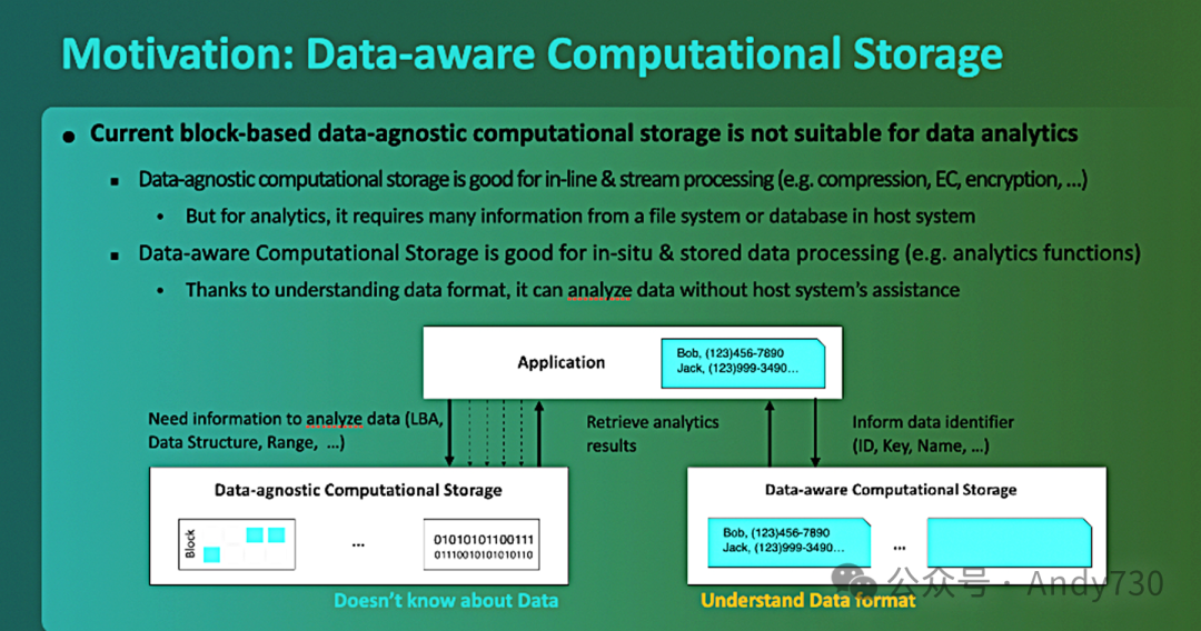 OCS被认为是数据感知的。这是因为基于块的存储系统除了知道逻辑块地址(LBA)和范围之外,对其数据内容一无所知。而对象存储系统则存储元数据,其中可以包含数据内容标识符,如ID、键、名称等。本地处理可以在键值计算型存储驱动器(KVCSD)上使用这些索引元数据来选择所需的数据项。