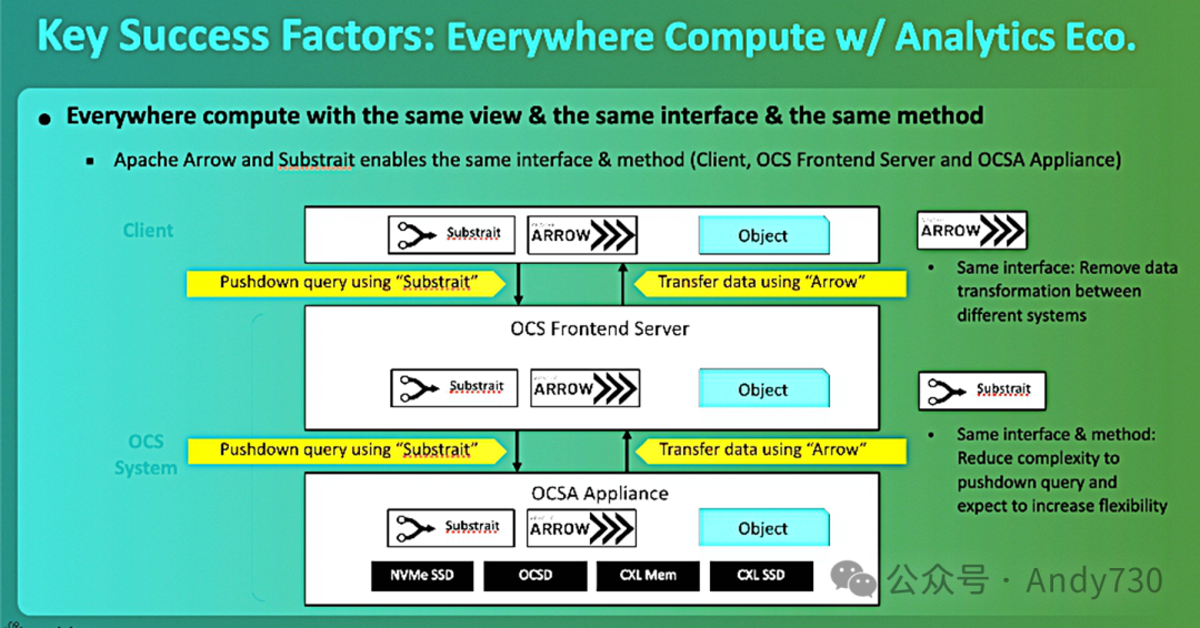 OCS项目涉及使用Apache分析生态系统的分析软件栈,包括Substrait和Arrow。Substrait提供了分析查询计划的标准化开放表示,允许将查询的一部分从基于S3的存储服务器推送到OCS计算型存储,具体而言,是作为后端存储的对象计算型存储阵列(OCSA)。