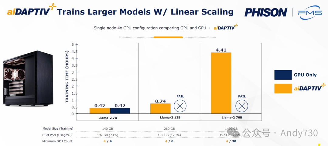 通过将这些AI SSD用作GPU VRAM的扩展,企业可以在不依赖高成本AI训练专用GPU的情况下,利用一组相对经济的现成RTX GPU来重新训练模型,从而显著降低总拥有成本(TCO)。该中间件还包含了与AI系列SSD(目前支持Gen 4 x4接口,提供U.2或M.2规格尺寸)购买相关的许可服务。利用SSD作为缓存层,企业可以在使用最少GPU资源的情况下,对具有庞大参数的模型进行微调,无需过度依赖GPU的HBM容量。