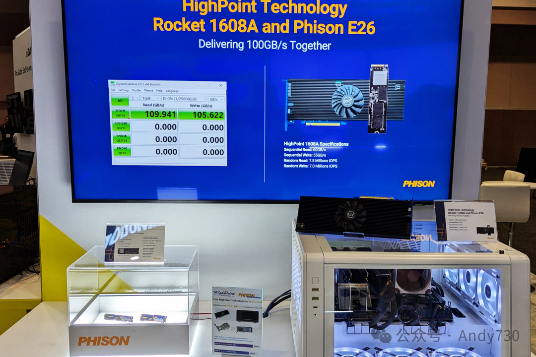值得一提的是,群联还展示了如何在普通桌面工作站上实现超过100 GB/s的顺序读写速度,尽管这并非纯粹的企业级演示。他们通过安装两块HighPoint Rocket 1608A扩展卡(每卡配备八个M.2插槽),并将16个M.2硬盘配置为RAID 0阵列,成功实现了这一目标。