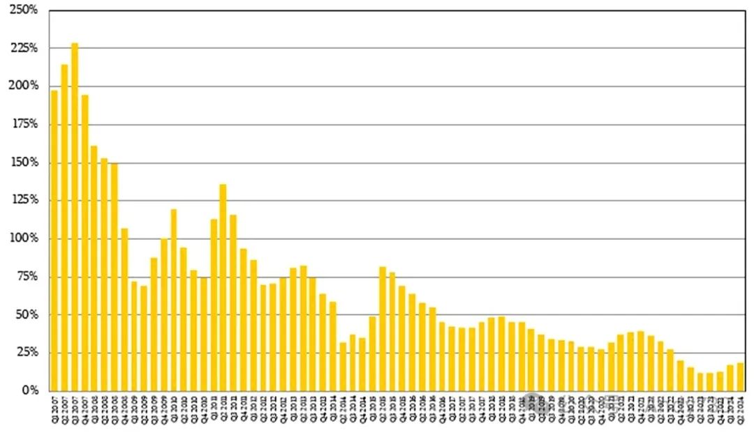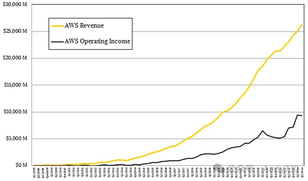 AWS曾经每季度都实现翻倍或三倍增长,但那些日子早已过去。2016年末至2019年初,AWS的增长率在40%至50%之间波动。即便在2020年第二季度新冠疫情引发的云计算支出激增中,AWS的增长率也未超过40%。2023年及2024年上半年,平均增长率仅为16%。