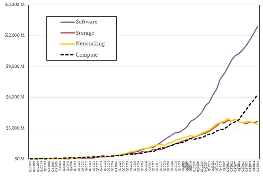 尽管AWS的增长率值得关注,但我们更关心其业务在计算、存储、网络和软件等方面的具体分布。Amazon未提供这种详细的业务划分,但我们有一个模型可进行估算。需要说明的是,这个模型更多基于强烈直觉而非确凿数据。虽然我们认为Amazon应该这么做,但AWS并未以这种方式讨论其业务。