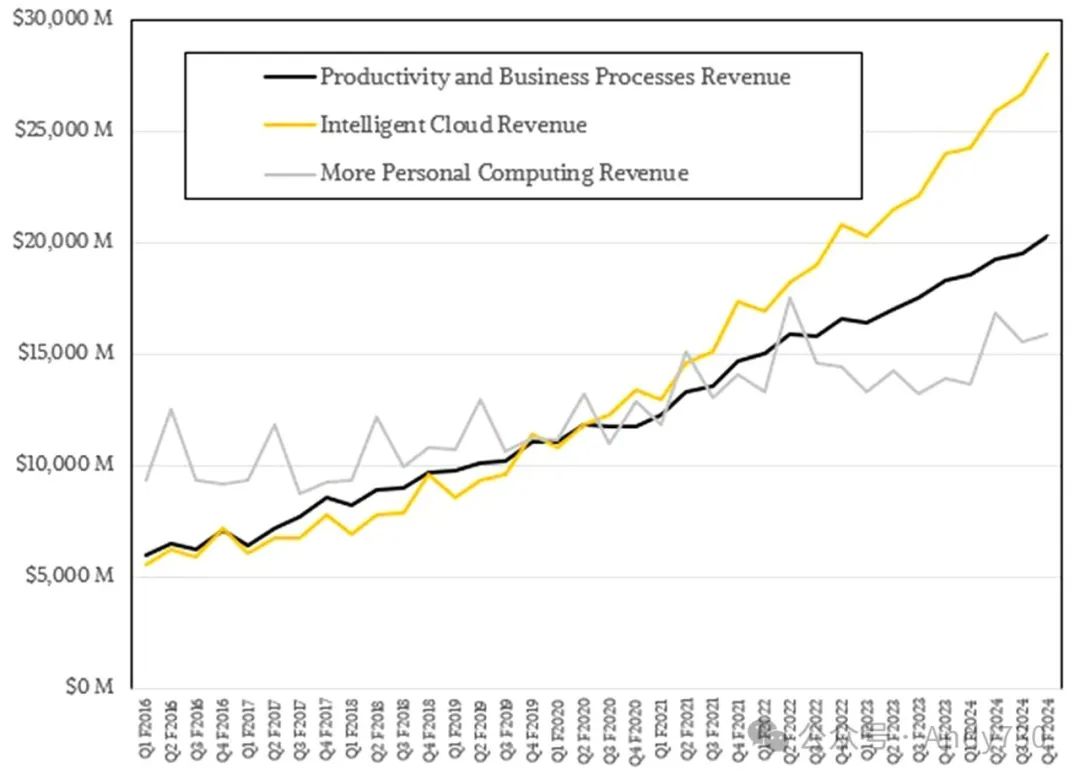 在截至6月的2024财年第四季度中,智能云业务组的销售额为285.2亿美元,同比增长18.8%,运营收入为128.6亿美元,同比增长22.2%。这一运营收入占销售额的45.1%,比例相当可观。(利润率高于PC业务,但低于应用软件业务,这是有道理的。)