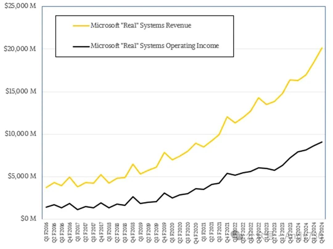 我们需要进行大量复杂运算,将智能云业务组的数据转化为可与其他云服务和系统制造商比较的有用信息。经分析,我们发现Microsoft的“实际”系统业务(包括Azure云上的基础设施和基础系统软件,分布在全球数千万个数据中心)在2024财年第四季度的销售额约为201.2亿美元,同比增长23%,运营收入为90.7亿美元,同比增长26.5%。