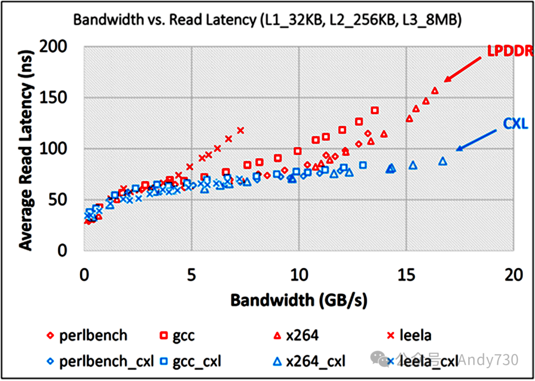 CXL在另一方面与传统内存接口有所不同,这种差异影响了服务质量:CXL支持全双工操作,允许同时进行读写操作。相比之下,传统的DRAM接口,例如双倍数据率(DDR),采用的是半双工模式:从读取切换到写入并返回需要插入延迟时间“气泡”,这会影响性能和服务质量。图1展示了FLIT-MRAM与低功耗DDR(LPDDR)内存的比较。在图的左下角,轻负载应用下,CXL接口的延迟使得LPDDR略占优势。然而,随着应用负载的加重,例如在多核处理器的典型情况下,LPDDR的半双工特性成为主导因素,导致访问时间显著增加。FLIT-MRAM利用CXL的全双工特性来掩盖这些缺点,即使在重负载下也能保持更稳定的性能。