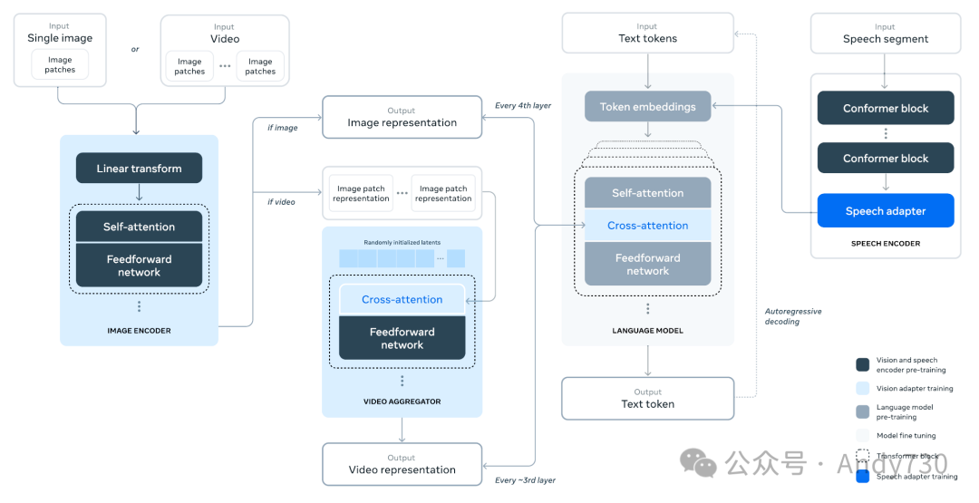 图28 研究中将多模态能力添加到Llama 3的组合方法的示意图。此方法导致了一个在五个阶段训练的多模态模型:(1)语言模型预训练,(2)多模态编码器预训练,(3)视觉适配器训练,(4)模型微调,以及(5)语音适配器训练。