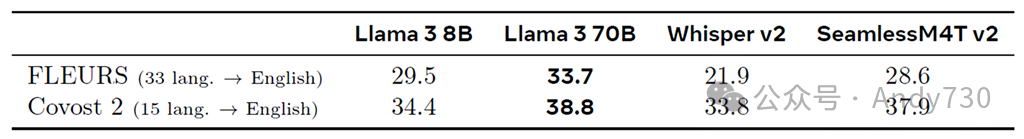 表32 我们语音接口在语音翻译任务上的BLEU分数。我们报告了Whisper和SeamlessM4T的性能作为参考。