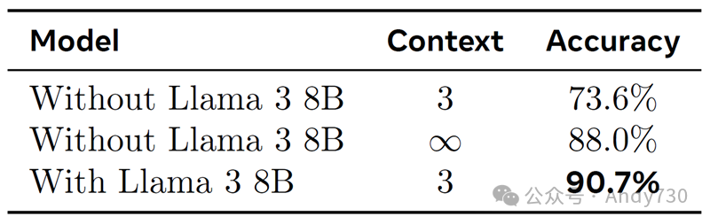 文本规范化。为了衡量Llama 3嵌入的效果,我们进行了不同右上下文量的实验。我们训练了一个使用3个TNtokens(由Unicode类别划分)的右上下文的模型,并将其与不使用Llama 3嵌入的模型进行比较,这些模型使用3tokens右上下文或完整双向上下文。正如预期的那样,表34显示,使用完整右上下文可以提高不使用Llama 3嵌入模型的性能。然而,结合Llama 3嵌入的模型性能优于所有其他模型,从而实现了无需依赖输入长上下文的逐tokens率输入/输出流。