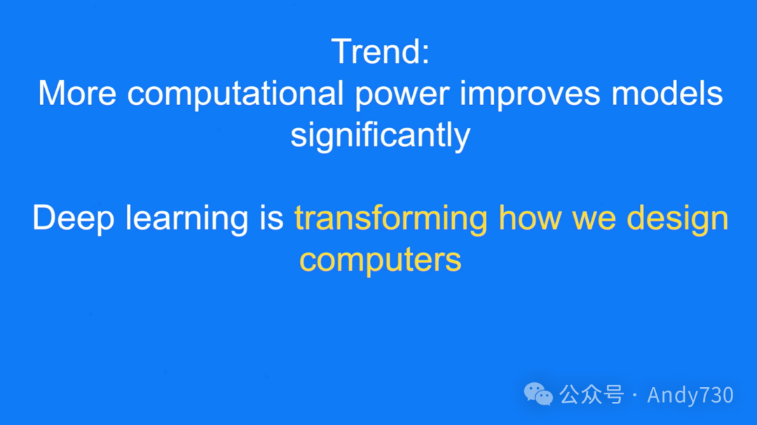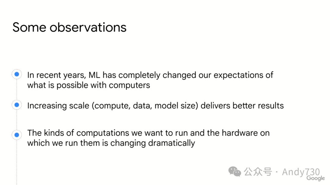另一个观察是规模的扩大:计算资源的使用规模增加,以及专用计算的出现。更大、更有趣和更丰富的数据集,以及更大规模的机器学习模型。扩大这些因素通常能带来更好的结果,这在过去十到十五年里一直如此。每次我们扩大规模,事情就会变得更好。新的能力突然出现,或者某些问题的准确性达到一个阈值,之前这些问题是无法处理的,现在却变得可行,从而使新的应用成为可能。我们需要的计算量,与传统的手写C++代码(许多基本CPU设计时所针对的代码)相比,已经发生了很大变化。我们需要不同类型的硬件来更高效地运行这些计算。从某种意义上说,我们可以专注于计算机执行的一小部分任务,极其高效地完成这些任务,然后利用不断扩大的规模实现更多的可能性。