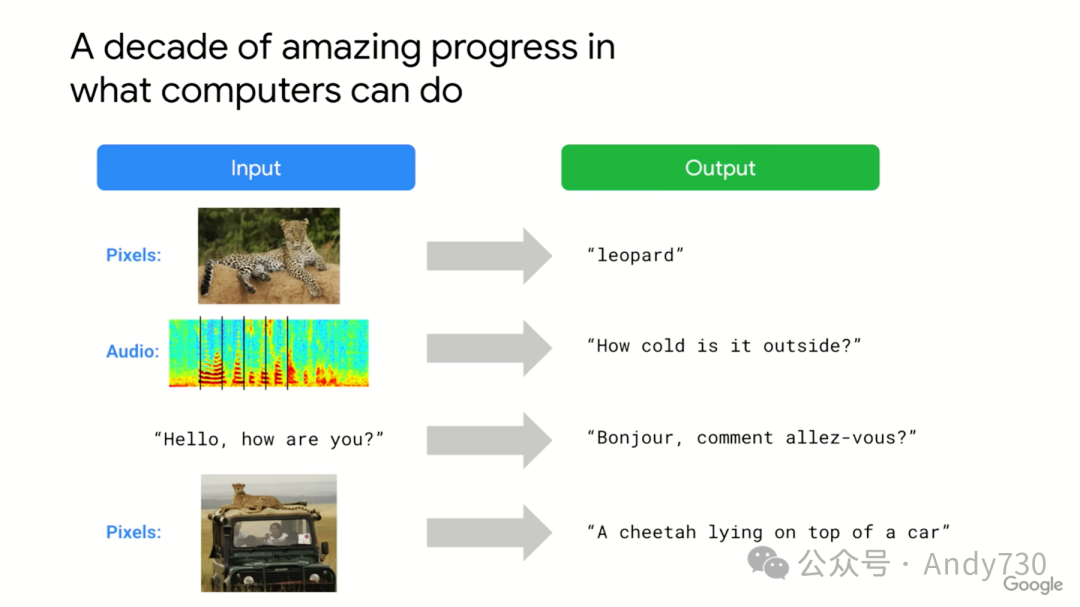 在过去十年中,计算机的能力取得了令人惊叹的进展。例如,从图像的原始像素到可能的1000个不同类别中的一个分类标签。十年前计算机还无法做到这一点,但现在可以了。从音频波形中识别出5秒音频中的所说内容,这就是语音识别,我们在这方面取得了巨大的进步。翻译:“Hello, how are you?” 到 “Bonjour”。将一种人类语言翻译成另一种语言,对计算机帮助我们来说是一项非常有用的能力。我们甚至能够将“这是一个在吉普车上的猎豹的照片”转化为描述。不仅仅是像“猎豹”这样的分类标签,而是描述场景中的实际情况的简短句子。这真是令人惊叹,我们在这方面取得了巨大的进展。