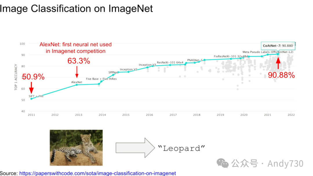 在2011年,这个竞赛第一次举行时,获胜者的准确率为50.9%。在随后的竞赛中,Alex Krizhevsky、Ilya Sutskever和Geoffrey Hinton撰写的一篇著名论文,即AlexNet,实现了巨大的飞跃,准确率提高了约133%。这一改进非常显著。当时约28个参赛者中只有一个使用了神经网络,这一进展显然是重大突破。次年,几乎所有参赛者都开始使用神经网络,因为这种方法的革命性改进明显展示了从原始数据中学习的主要优势,而不是依赖手工设计特征来识别猎豹。例如,如何手动设计特征来判断一只动物是猎豹还是长颈鹿或汽车?这是一件非常困难的事情,但从数据中学习使得这一切成为可能。