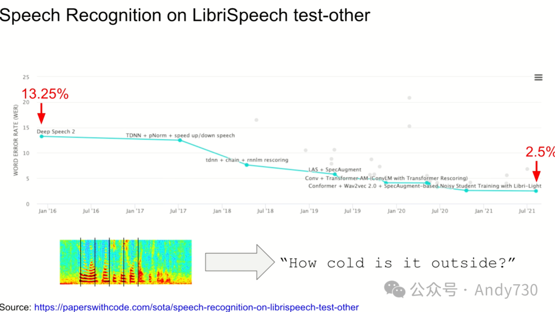 对于语音识别,这是一个流行的开源基准,用于测量语音识别的准确性。这里测量的是字词错误率,即错误单词的百分比,目标是数值越低越好。我们已经从13.25%降到了2.5%。这段时间非常短——仅仅五年左右。基本上,我们从每六七个单词中有一个错误,变成了每40个单词中有一个错误。这大大提升了这些系统的可用性。突然之间,你可以依赖这些系统开始编写电子邮件,系统能大部分时间正确识别内容。这真是非常棒的进展。